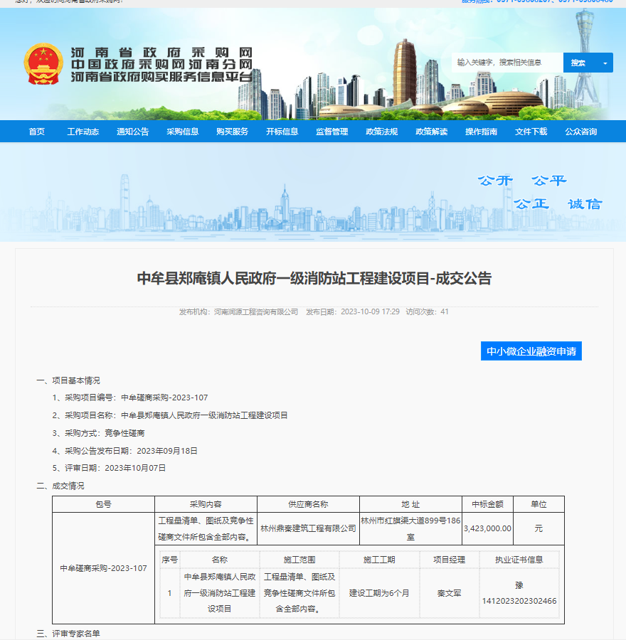 中標:中牟縣鄭庵鎮人民政府一級消防站工程建設項目